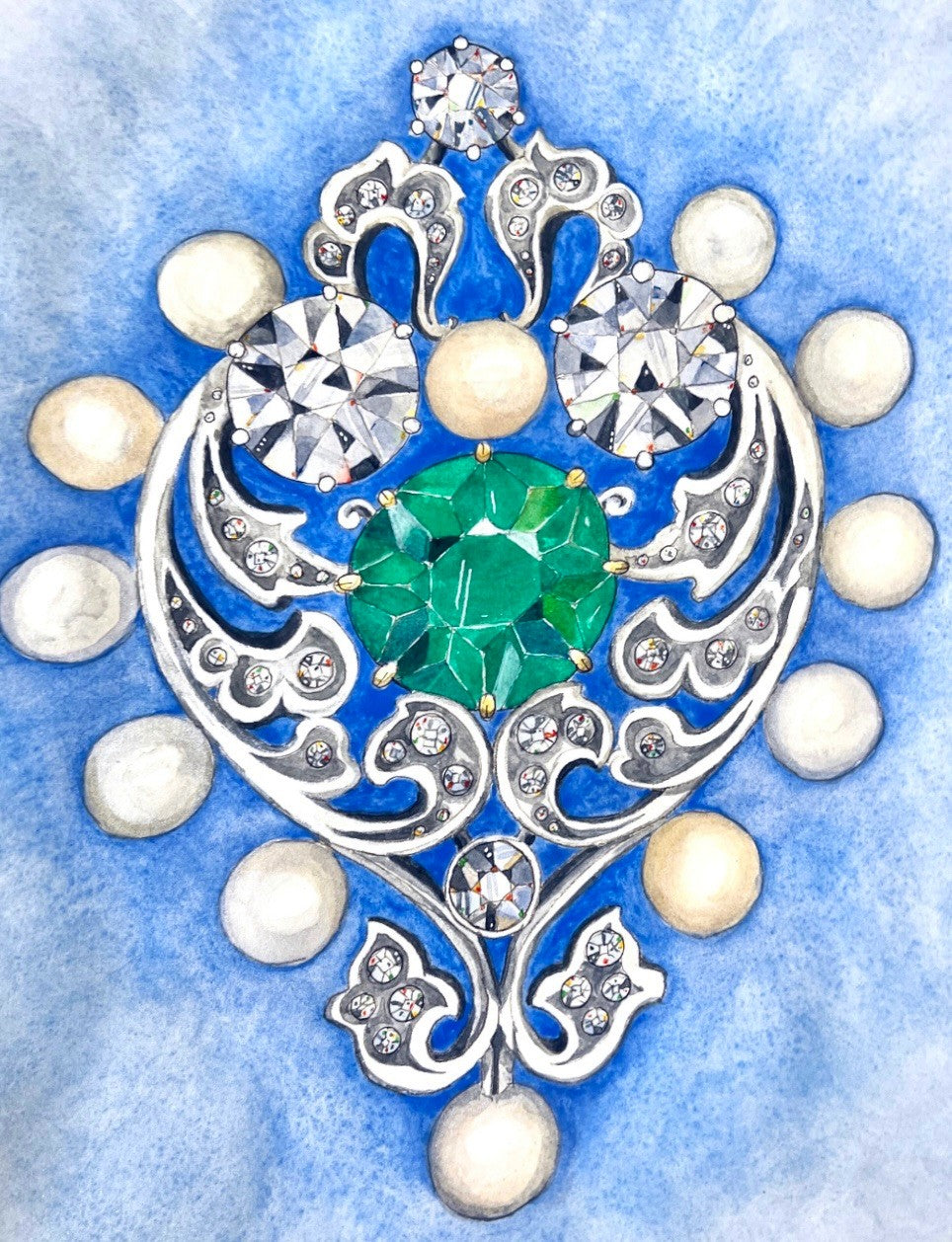 This Marcus & Co. platinum brooch, circa 1900, came across my desk while appraising in 2013. It was undoubtedly the most beautiful piece of jewelry I've ever held in my hand! The heir wanted to sell the brooch, so it went to Sotheby's for auction, and while the estimated price was between $15-20K, the hammer landed at $179K! Stunning emerald, 12 natural pearls and 3 carats total in diamonds, it was spectacular. Painting this brooch was pure joy for me!